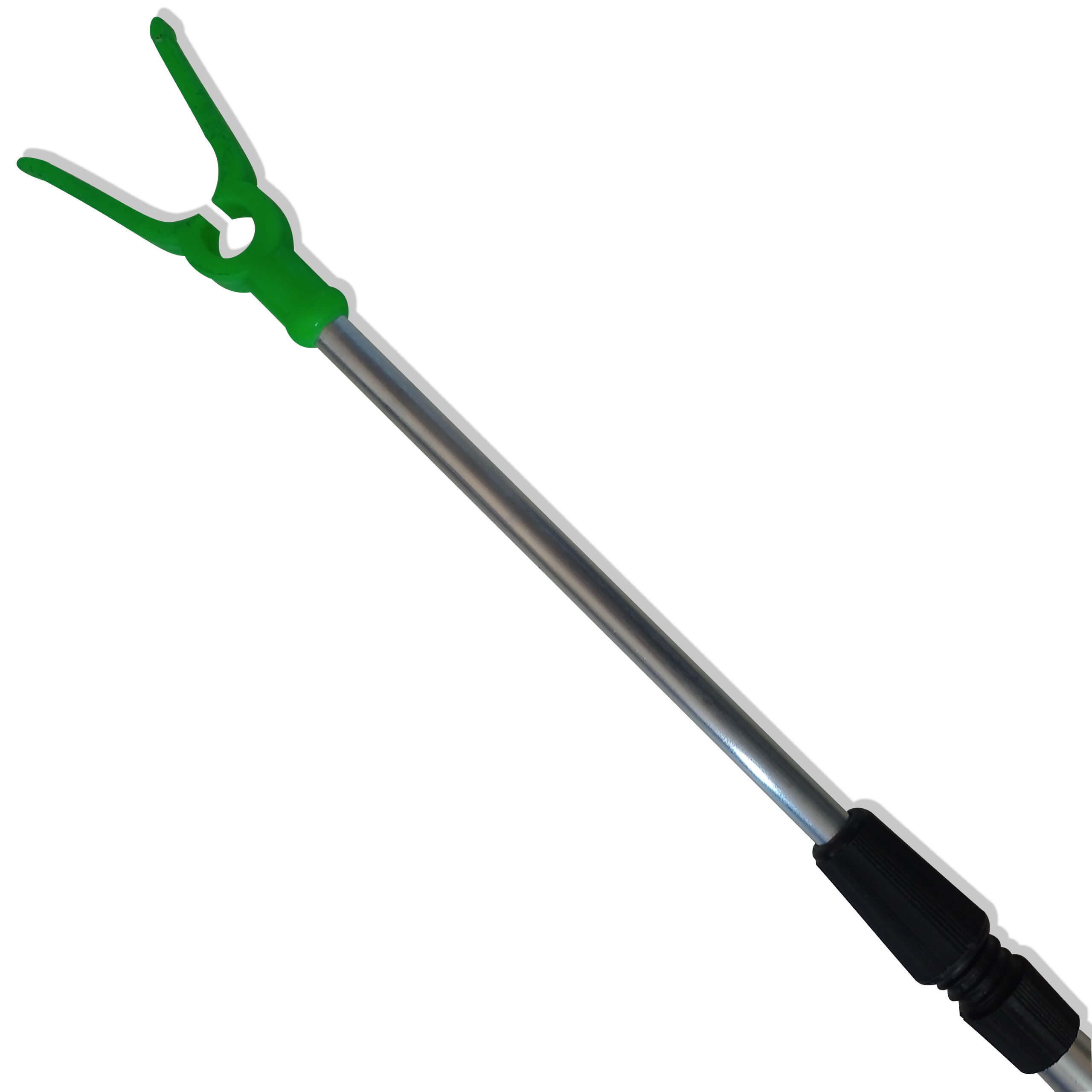 Ótimo suporte para varas, altura regulada por um sistema de dois bastões de alumínio que se prendem por uma rosca.